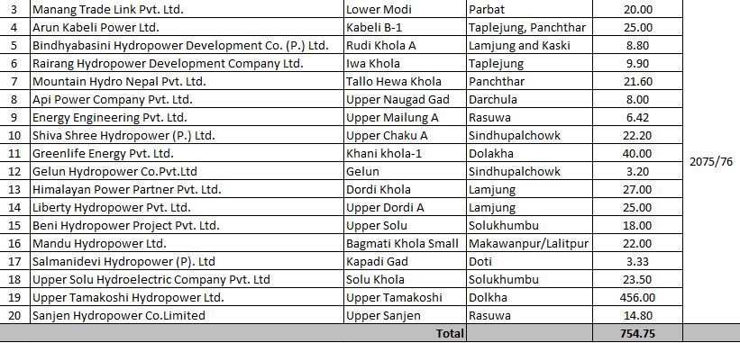 चालु आर्थिक वर्ष ०७४–०७५ मा सार्वजनिक र निजी क्षेत्रबाट गरी १०० मेगावाट मात्र बिजुली थप भएको छ । गत साउन यता १६ आयोजना सम्पन्न भई प्रणालीमा १०० मेगावाट बिजुली थप भइसकेको छ । यसमध्ये निजी क्षेत्रबाट १५ आयोजना सम्पन्न भई ७० मेगावाट र विद्युत प्राधिकरणको लगानीमा ३० मेगावाटको चमेलिया आयोजना सञ्चालनमा आएको छ ।