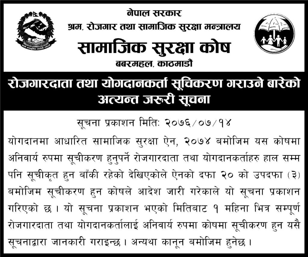 काठमाडौं, कार्तिक १४- सरकारले योगदानमा आधारित सामाजिक सुरक्षा कोषमा आवद्ध हुने समयावधि एक महिना थप गरेको छ । उल्लेख्य संख्यामा रोजगारदाता र कामदार सूचिकरण हुन बाँकी रहेको भन्दै सूचीकरणका लागि एक महिना थप गरिएको सामाजिक सुरक्षा कोषले जनाएको छ।