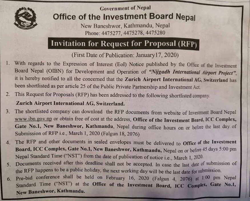 लगानी बोर्ड नेपालले प्रस्तावित निजगढ अन्तर्राष्ट्रिय विमानस्थलको लागि स्वीटजरल्यान्डको जुरिच एयरपोर्ट ईन्टरनेशनल एजीलाई सर्ट लिस्टमा राख्दै शुक्रवार सूचना प्रकाशित गरेको छ ।