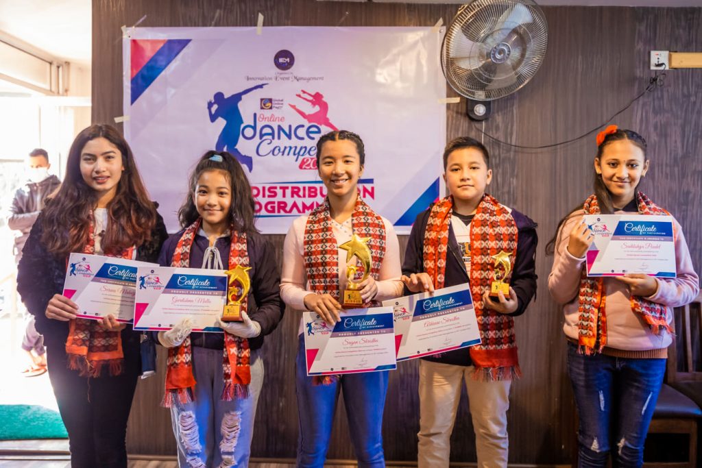 ग्लोवल अनलाईन पे को प्रस्तुती तथा ईनोभेशन ईभेन्ट मेनेजमेन्टको आयोजनामा सम्पन्न ‘अनलाईन डान्स कम्पिटिसन,२०२०’ को बिजेताहरुलाई पुरस्कार वितरण गरिएको छ । विश्वव्यापी आतंकको रुपमा फैलिएको कोरोना भाइरसलाई मध्यनजर गरी भौतिक दुरी कायम गर्दै बिजयीहरुलाई राजधानीको नयाँ बानेश्वरमा एक कार्यक्रमविच आयोजकले पुरस्कृत गरेका हुन् ।