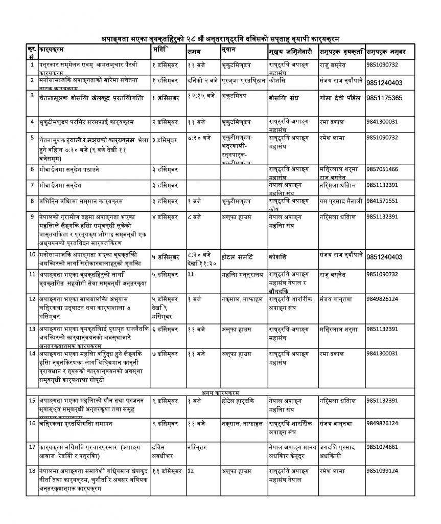 राष्ट्रिय अपाङ्ग महासंघले अपाङ्गता भएका व्यक्तिहरुको २८ औं अन्तर्राष्ट्रिय दिवस सप्ताहव्यापी रुपमा विभिन्न कार्यक्रम गरी मनाउने भएको छ । महासंघले नाटक, खेलकुद, सरसफाइ कार्यक्रम, जनचेतनामुलक र्याली तथा गोष्ठीहरु गरी सप्ताहव्यापी रुपमा दिवस मनाउन लागेको हो । महासंघले सप्ताहव्यापी रुपमा गर्ने कार्यक्रम यस्ता छन्