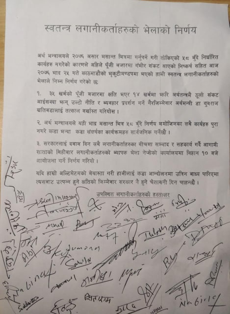 अर्थ मन्त्रालयले २०७६ मसान्त भित्रमा गर्नुपर्ने गरि तोकिएको ५८ बुँदे सुधारका कामहरु नगरेका कारण पुँजी बजारमा गम्भीर आएको भन्दै लगानीकर्ताहरुले यतो निर्णय लिएको बताए ।