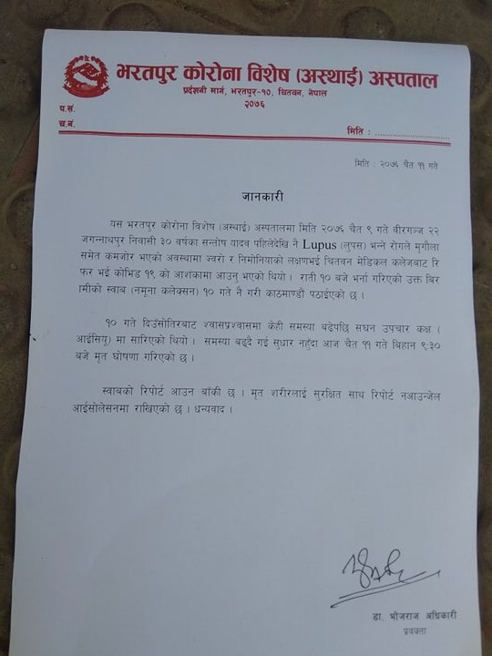 मृतक यादव लुपस नामक रोगका बिरामी थिए भने उनको मिर्गौला कमजोर रहेको अस्पतालले जनाएको छ । अस्पतालले आज जारी गरेको बिज्ञप्ती अनुसार यादवलाई लुपस रोगले मृगौला कमजोर बनाएर ज्यान गएको जनाइएको छ । उनलाई ज्वरो र निमोनिया समेत देखिएपछि चैत ९ गते राती १० बजे चितवन मेडिकल कलेबाट रिफर गरी कोरोना अस्पतालमा भर्ना गरिएको थियो ।