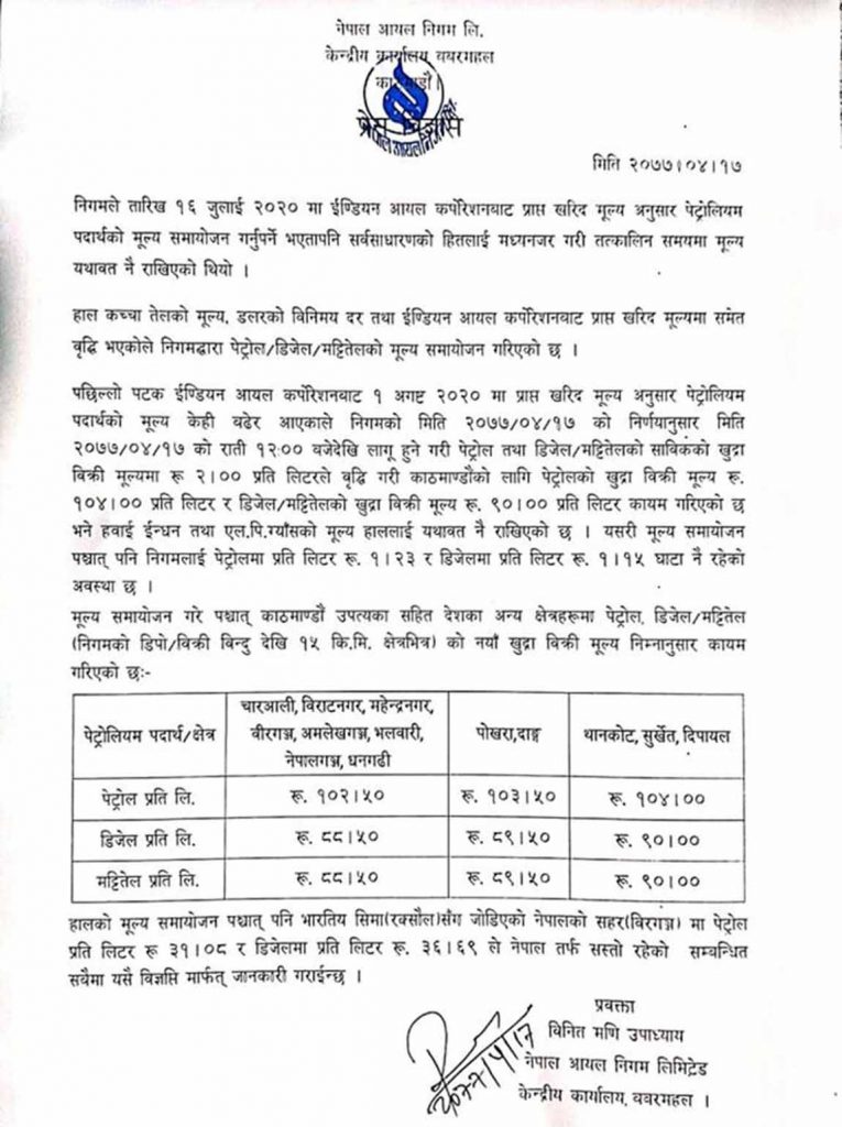 निगमका प्रवक्ता विनितमणि उपाध्यायका अनुसार इण्डियन आयल कर्पोरेशनले पठाएको खरिद मूल्यअनुसार पेट्रोलियम पदार्थको मूल्य केही बढेर आएकाले मूल्य बढेको हो।