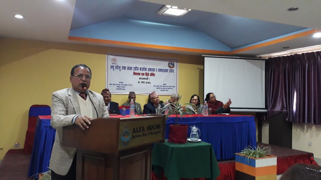 नेपाल घरेलु तथा साना उद्योग महासंघ र नेपाल सरकार उद्योग वाणिज्य तथा आपूर्ति मन्त्रालयअन्तरगत लघु, घरेलु तथा साना उद्योग विकास कोषले संयुक्त रुपमा राजधानीमा आयोजना गरेको ‘लघु, घरेलु तथा साना उद्योगमा कर्जाका समस्या र समाधानका उपाय’ विषयक एक दिने कार्यशाला गोष्ठीका सहभागीहरुले स्थानीयदेखि अन्तराष्ट्रिय क्षेत्रमा समेत बजारीकरण गर्दै मुलुकको व्यापार घाटा न्यूनीकरणमा सघाइरहेका उद्योगहरु वित्तीय लगानीको अभावकै कारण खुम्चनु परेको गुनासो उनीहरुले गरेका छन् ।