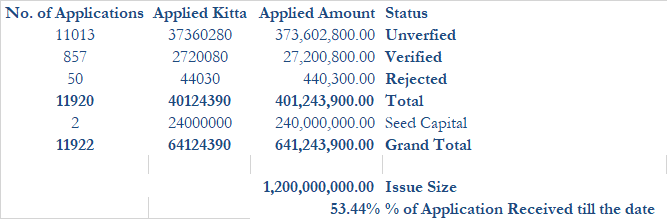 काठमाडौं, वैशाख १४ – एनआईबिएल एस क्यापिटलले बिक्रीमा ल्याएको एनआईबिएल समृद्धि फण्ड–२ को पहिलो दिनमा नै उत्साहप्रद रुपमा आवेदन परेको छ । इकाई खरिदको लागि कुल इकाईको ५३.४४ प्रतिशत इकाई आवेदन भइसकेको क्यापिटलले जनाएको छ ।