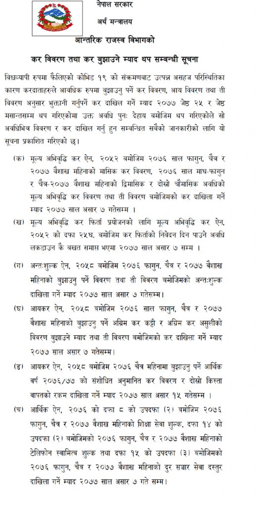 २१ जेठ, काठमाडौं । आन्तरिक राजश्व विभागले कर वुझाउने म्याद असार ७ गतेसम्म थप गरेको छ ।