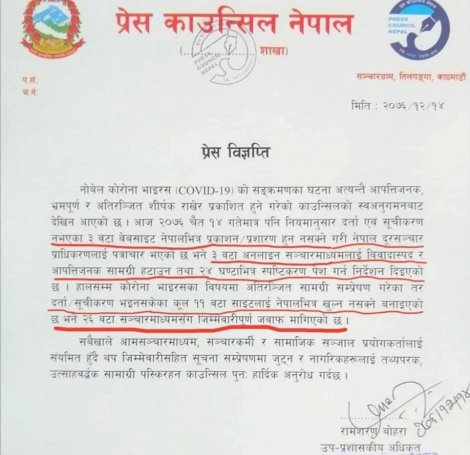सूचिकृत नभइ सञ्चालनमा रहेर कोरोनाबारे भ्रम फैलाउने र डर पैदा गर्ने ११ वटा अनलाइनलाइ नेपालभर हेर्न नमिल्ने बनाइएको प्रेस काउन्सिलले एक विज्ञप्ति जारी गरी जानकारी दिएको छ ।