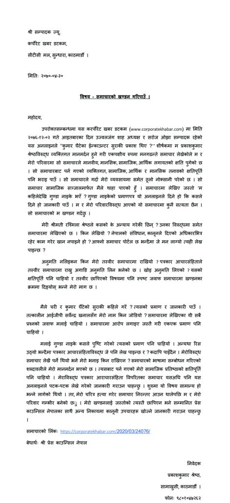 साउन ३२, यस कर्पोरेट खबर डट कम अनलाईनबाट मिति२०७६–१२–२ मा प्रकाशित “कुमार घैटेको इन्काउन्टर सुराकी प्रकाश थिए ? शिर्षकको समाचारमा कुनै सत्यता नभएको तत्कालिन आईजिपी सर्वेन्द खनालसंग आफ्नो नाम जोडिनु पर्ने तथा चरी र कुमार घैटेको सुराकीमा आफ्नो कुनै संलग्नता नभएको भनि यस अनलाईनलाई मिति २०७७–४–३०मा प्रकाश कुमार श्रेष्ठले समाचार खण्डन गरी पाउ भनि निवेदन दिएको हुदाँ उक्त समाचारको खण्डन प्रकाशित गरिएको छ ।