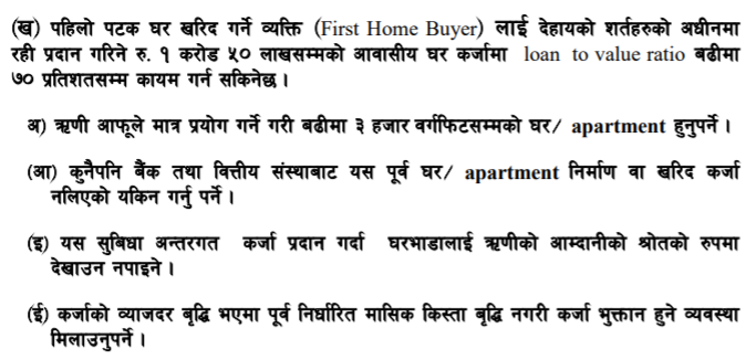 नेपाल राष्ट्र बैैंकले नयाँ निर्देशन जारी गर्दै घर तथा अपार्टमेन्ट खरिद कर्ताहरुलाई कुल मूल्यांकनको ७० प्रतिशतसम्म ऋण पाउने व्यवस्था गरेको हो । यस भन्दा पहिले काठमाडौं उपत्यकामा ५० प्रतिशत र उपत्यका बाहिर ६० प्रतिशत मात्रै ऋण पाइन्थ्यो ।