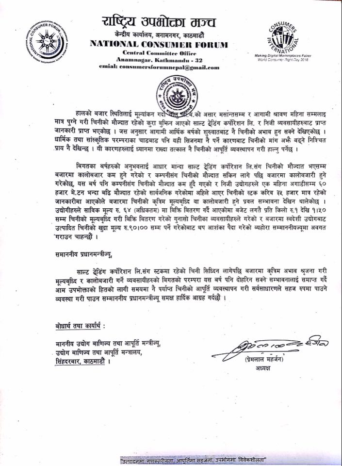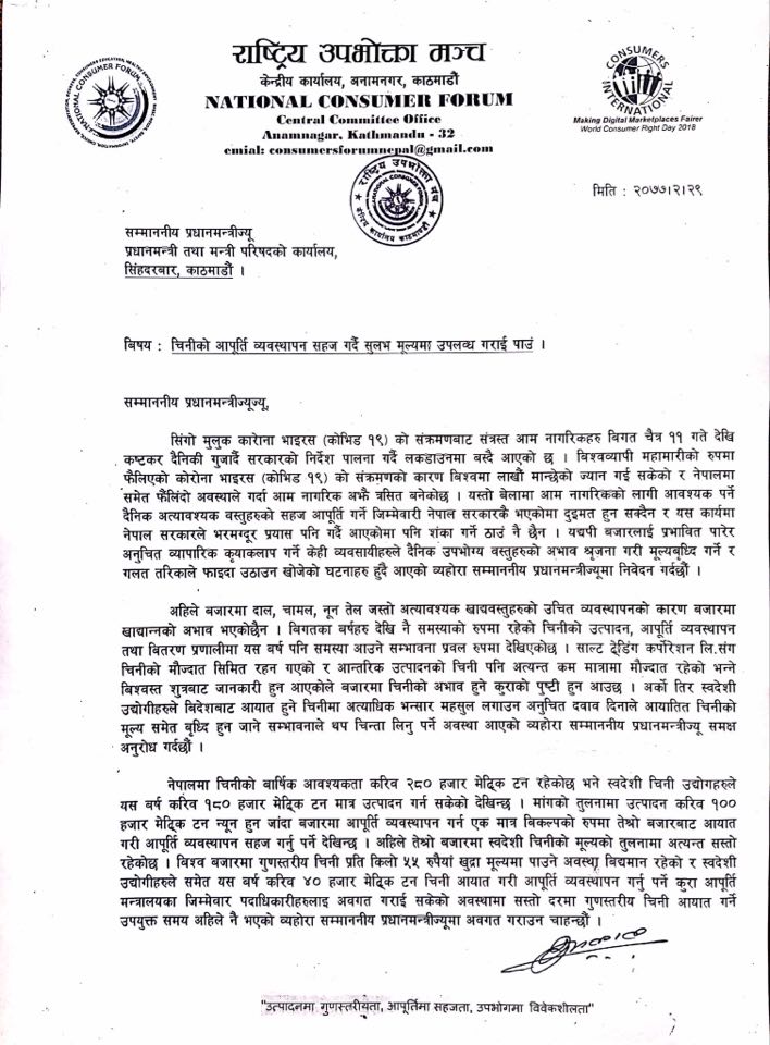 ’नेपालमा चिनीको बार्षिक आवश्यकता करिव २८० हजार मेट्रिक टन रहेकोछ भने स्वदेशी चिनी उद्योगहरुले यस बर्ष करिव १८० हजार मेट्रिक टन मात्र उत्पादन गर्न सकेको देखिन्छ । मागको तुलनामा उत्पादन करिव १०० हजार मेट्रिक टन न्यून हुन जांदा बजारमा आपूर्ति व्यवस्थापन गर्न एक मात्र बिकल्पको रुपमा तेश्रो बजारबाट आयात गरी आपूर्ति व्यवस्थापन सहज गर्नुपर्ने देखिन्छ । अहिले तेश्रो बजारमा स्वदेशी चिनीको मूल्यको तुलनामा अत्यन्त सस्तो रहेकोछ । बिश्व बजारमा गुणस्तरीय चिनी प्रति किलो ५५ रुपैयां खुद्रा मूल्यमा पाउने अवस्था बिद्यमान रहेको र स्वदेशी उद्योगीहरुले समेत यस बर्ष करिव ४० हजार मेट्रिक टन चिनी आयात गरी आपूर्ति व्यवस्थापन गर्नुपर्ने कुरा आपूर्ति मन्त्रालयका जिम्मेवार पदाधिकारीहरुलाइ अवगत गराई सकेको अवस्थामा सस्तो दरमा गुणस्तरीय चिनी आयात गर्ने उपयुक्त समय अहिले नै भएको व्यहोरा सम्माननीय प्रधानमन्त्रीज्यूमा अवगत गराउन चाहन्छौं ।’ मंचद्वारा प्रेसित पत्रमा भनिएको छ ।