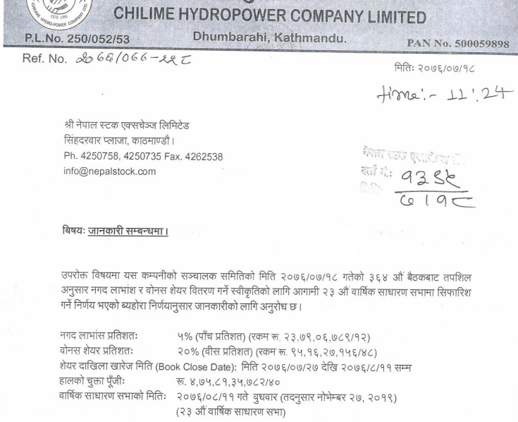 कम्पनीले मंसिर ११ गते साधारणसभा गर्ने भएको छ । साधारणसभा प्रयोजनको लागि कम्पनीले कार्तिक २७ गतेदेखि बुक क्लोज गर्ने निर्णय गरेको छ ।