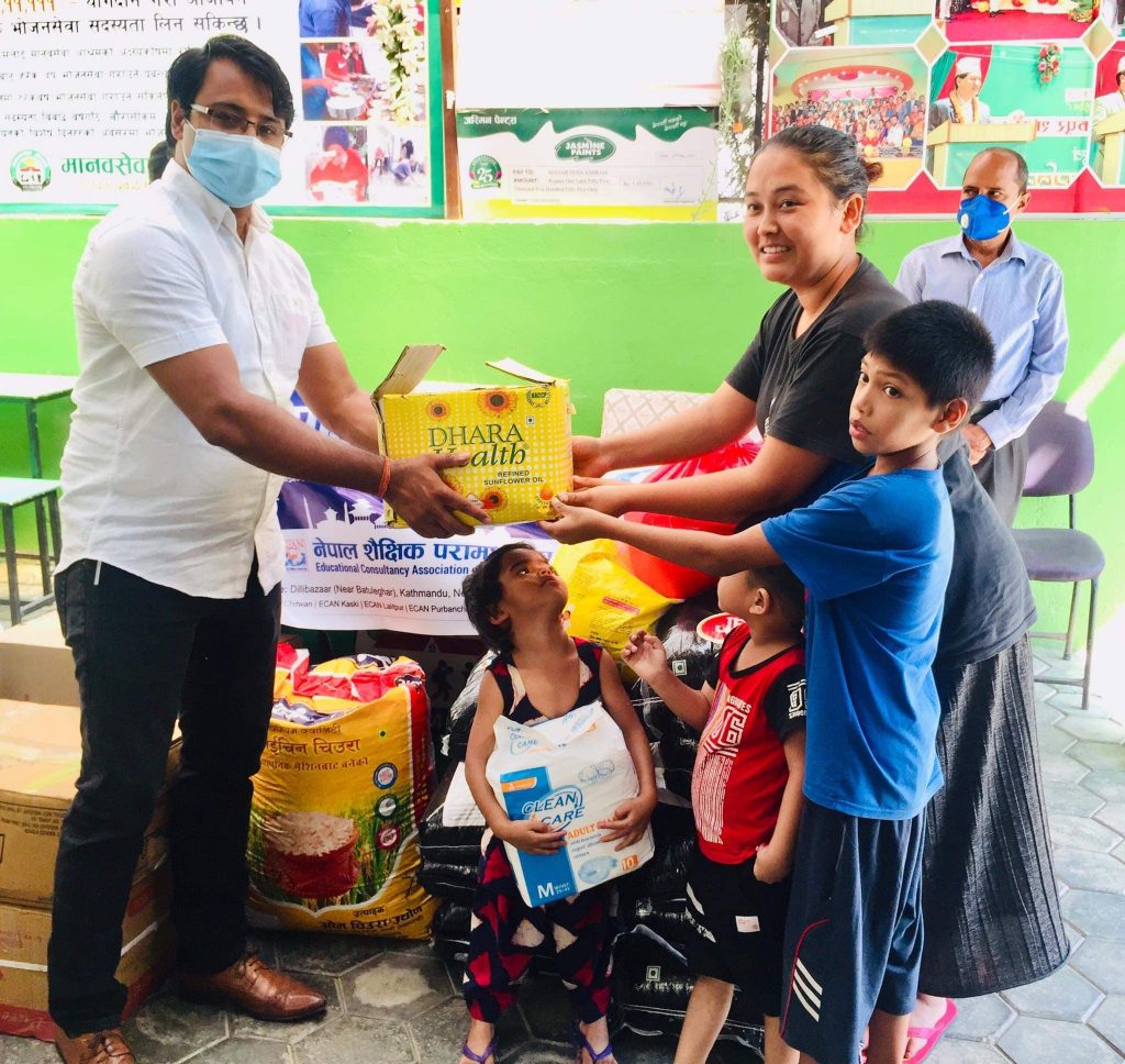 काठमाडौं, असोज २३ – नेपालको सबैभन्दा ठुलो र जेठो शैक्षिक परामर्शदाता संस्थाहरुको छाता संगठन नेपाल शैक्षिक परामर्श संघ (ईक्यान) ले आज शुक्रबार भक्तपुर र काठमाडौं जिल्लाका दुई सामाजिक संस्थामा पुगी ज्येष्ठ नागरिक र श्रमिक परिवारलाई सहयोग गरेको छ । विश्वभर फैलिएको कोरोना भाइरस (कोभिड–१९) संक्रमणका कारण लामो समय बन्दाबन्दी र निषेधाज्ञाले नेपालमा पनि ज्येष्ठ नागरिक ब्यबस्थापन गर्ने र ज्याला मजदुरी गर्ने श्रमिक बर्ग संघ सस्थाहरु अफ्ठ्यारो परिरहेको अवस्थामा ईक्यानले यो सहयोग गरेको हो ।