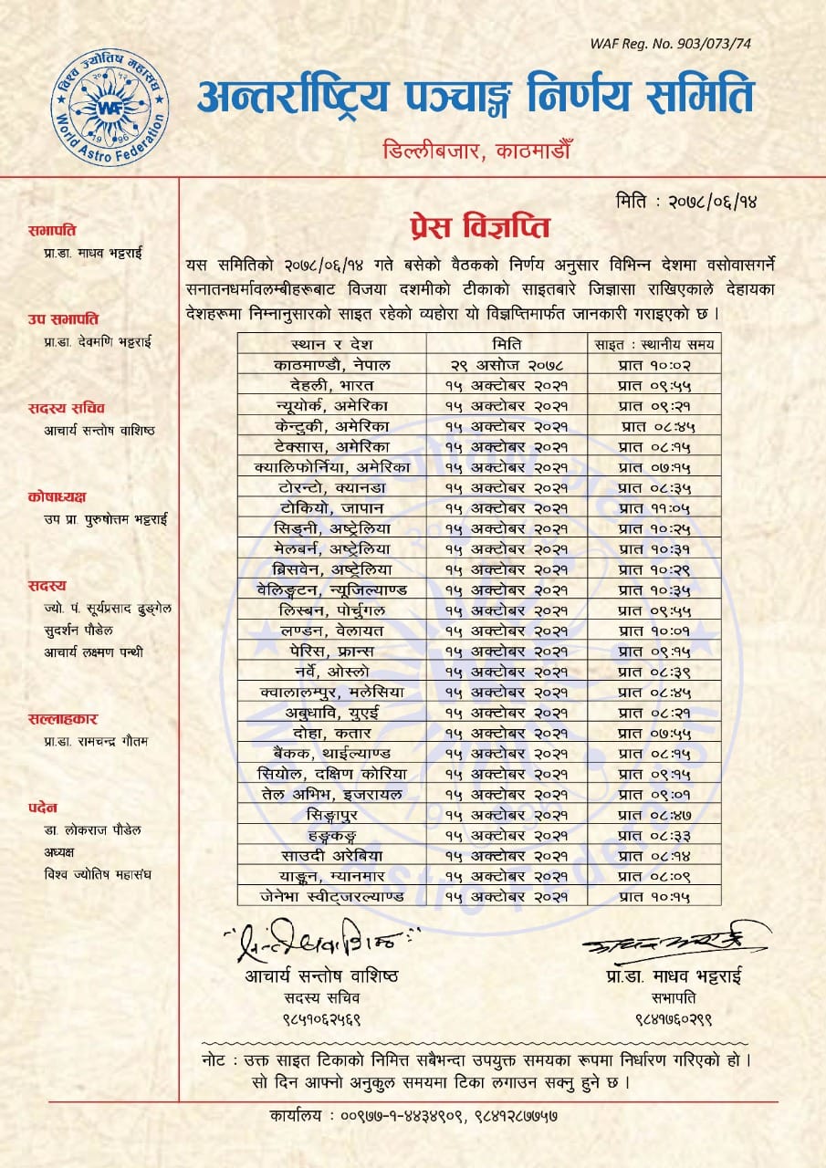 असोज १४ गते बजेको अन्तराष्ट्रिय पञ्चाङ्ग निर्णायक समितिको बैठकले नेपाल सहित नेपालीहरुको बसोबास रहेको अन्य देशको साइत तय गरेको अन्तर्राष्ट्रिय पञ्चाङ्ग निर्णायक समितिका सदस्य सचिव आचार्य सन्तोष वाशिष्ठले जानकारी दिए ।