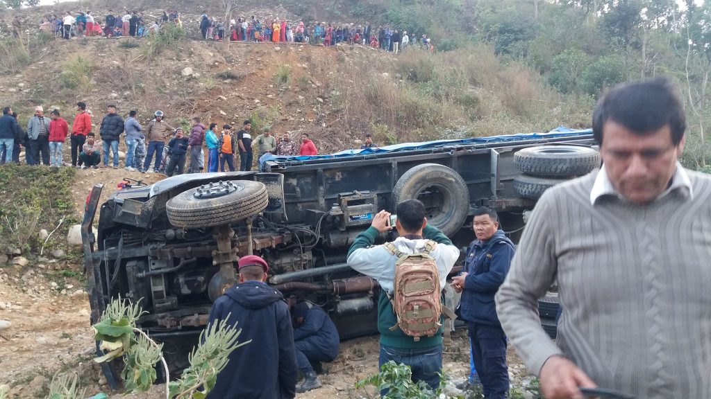 तनहुँ – तनहुँको देवघाट गाउँपालिका–५ कालीमाटीमा प्रहरीको गाडी दुर्घटनामा परेको छ ।पृथ्वीराजमार्ग दाशढुङ्गाबाट दक्षिण पट्टी पर्ने देवघाट जाने पक्की पुल कालीमाटी नजिकैको स्थानमा सडक साघुरो हुदाँ पोखरा तर्फ हिडेको उक्त टुटेन सडक बाट करिव ४५ मिटर तल त्रिशुली नदिको किनारमा पल्टिएको हो । दुर्घटनामा एकको प्रहरीको ज्यान गएको छ भने २९ जना घाइते भएका छन् । ज्यान गुमाउनेमा प्रहरी जवान सन्दीप केसी रहेका छन् । सवार ३४ जना मध्ये ३ जनाको अबस्था चिन्ताजनक रहेको छ। घाइतेहरुको अहिले पुरानो मेडिकल कलेज र चितवन मेडिकल कलेज भरतपुरमा उपचार भइरहेको जिल्ला प्रहरी कार्यालय तनहुँका प्रहरी नायब उपरीक्षक लीलाराज लामिछानेले जानकारी दिए ।गम्भीर अवस्थामा रहेका घाइतेहरुमा टोपबहादुर थापा, ईश्वर श्रेष्ठ ,टंक लामा रहेका छन्। २७ अन्य प्रहरी जवानको भने अवस्था मध्यम रहेको प्रहरी नायब उपरीक्षक लामिछानेले जानकारी दिए।
