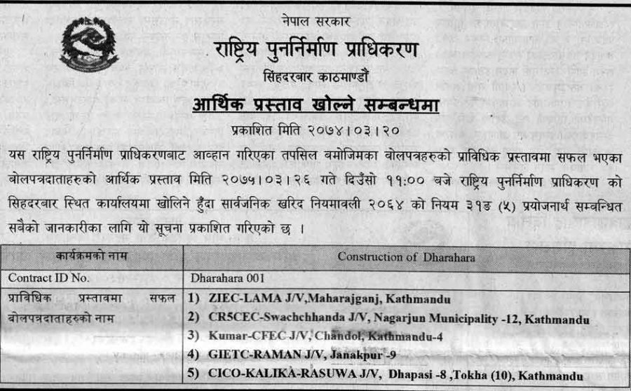 अब यी पाँच वटा कम्पनीहरुको आर्थिक प्रस्ताव असार २६ गते खोलिनेछ र सबै भन्दा कम रकममा धरहरा निर्माणको प्रस्ताव गर्ने कम्पनीले ठेक्का हात पार्नेछ ।