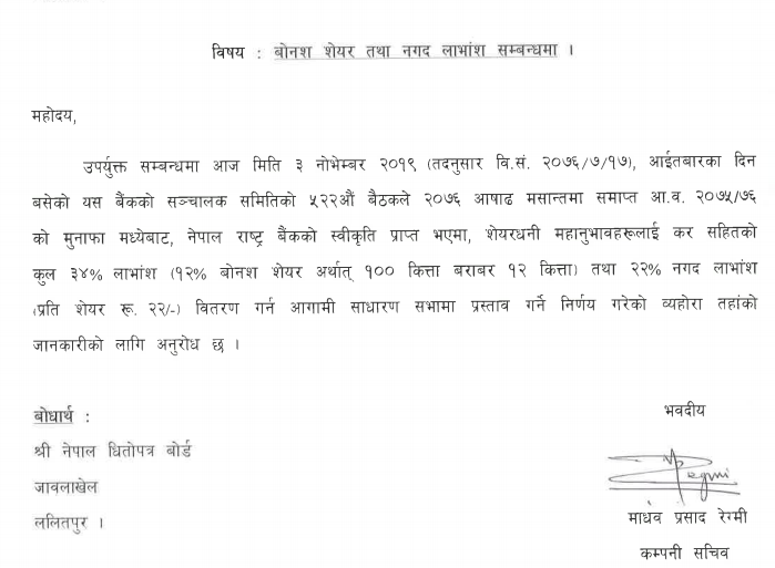 गत वर्ष पनि नवील बैंकले १२ प्रतिशत बोनस सेयर र २२ प्रतिशत नगद लाभांश नै वितरण गरेको थियो ।उक्त लाभांश नेपाल राष्ट्र बैंकले स्वीकृति दिएपछि र बैंकको आगामी साधारणसभाले पारित गरेपछि लगानीकर्तामा वितरण हुने छ ।