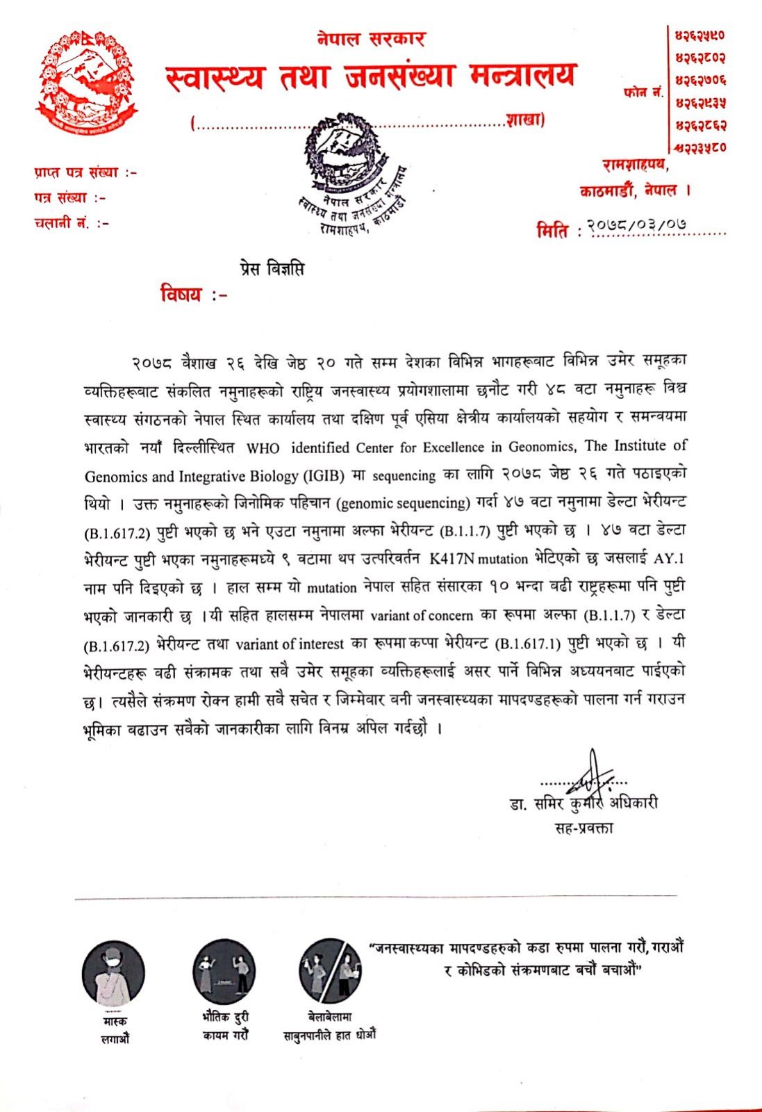 मन्त्रालयले वैशाख २६ देखि जेठ २० गतेसम्म देशका विभिन्न भागहरुबाट संकलित नमुनाहरुको राष्ट्रिय जनस्वास्थ्य प्रयोगशालाबाट छनौट गरी ४८ नमुना विश्व स्वास्थ्य संगठनको नेपालस्थित कार्यालय तथा दक्षिण पूर्व एसिया क्षेत्रीय कार्यालयको सहयोग र समन्वयमा परीक्षण गर्दा ७४ नमुनामा डेल्टा भेरियन्ट पुष्टि भएको थियो । जसमध्ये ९ वटामा थप उत्परिवर्तन के४१७एन