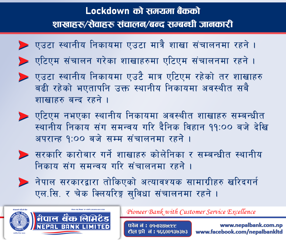 काठमाडौं, चैत १४- नेपाल बैंक लिमिटेडले लकडाउनको समयमा एक स्थानिय तहमा बैंकको एक शाखा मात्र खुला रहने जनाएको छ । बैंकले एटिएमहरु भने खुल्ला रहने जनाएको छ ।