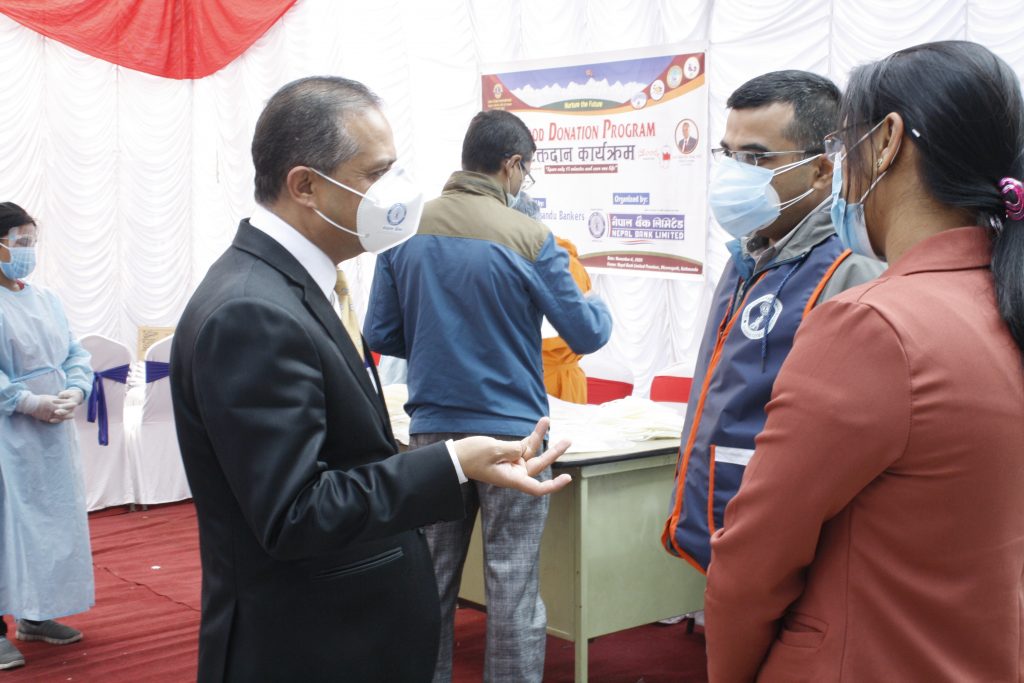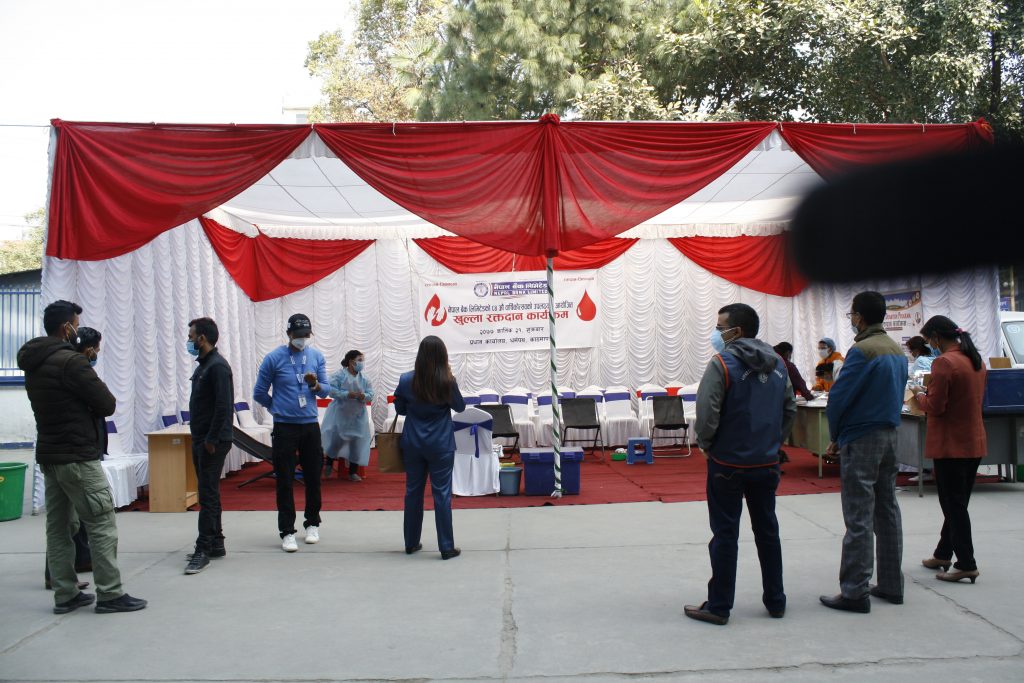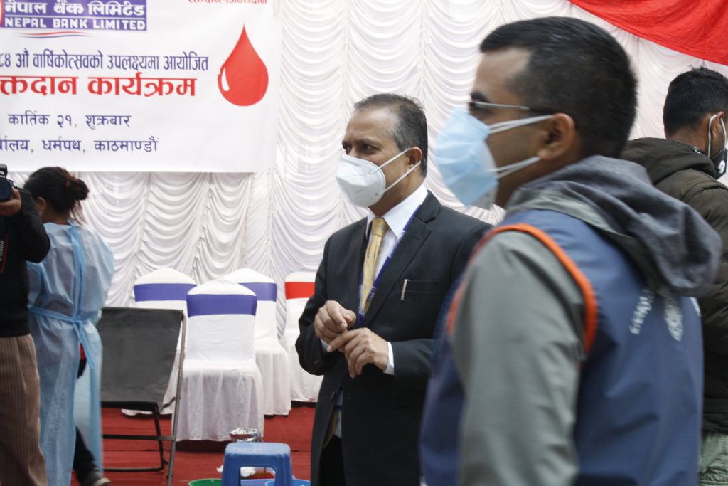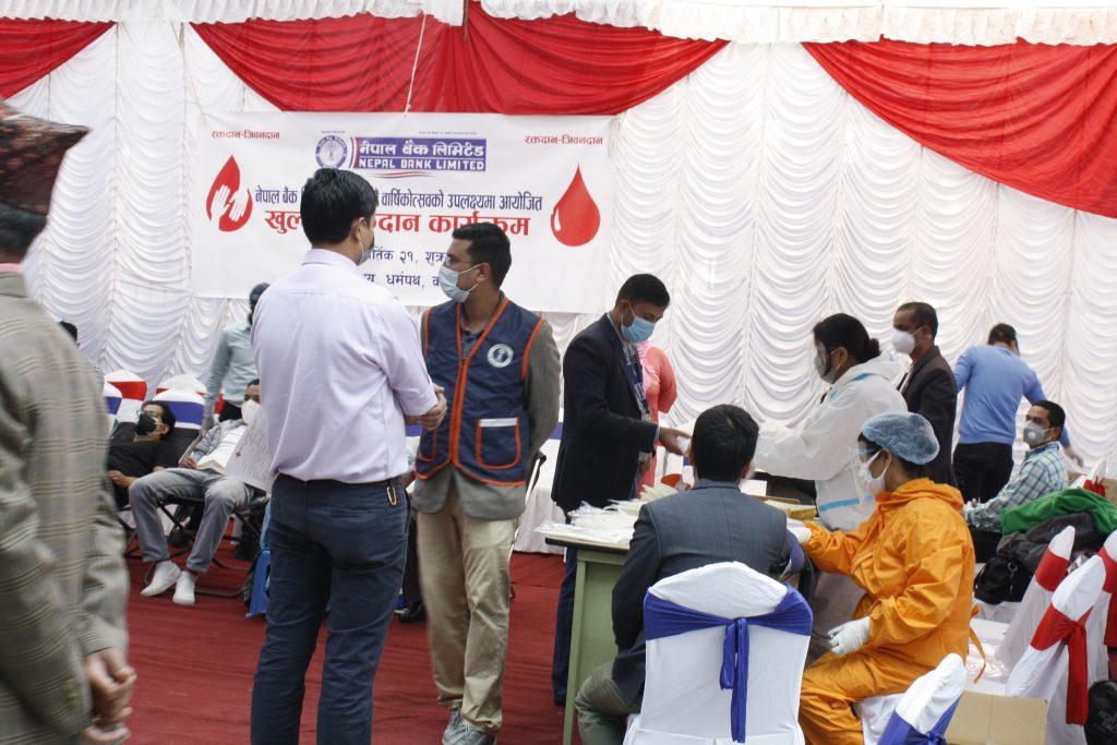 बैंकले कार्तिक २१ गते शुक्रबार केन्द्रिय कार्यालय परिसरमा रक्तदान कार्यक्रम गरेको हो । नेपाल बैङ्क लिमिटेडका सीईओ कृष्ण बहादुर अधिकारीले यो पुण्यको काममा सबैको सहभागिता र योगदान रहोस् भन्ने हेतुका साथ रक्तदान कार्यक्रम गरिएको बताएका छन् ।