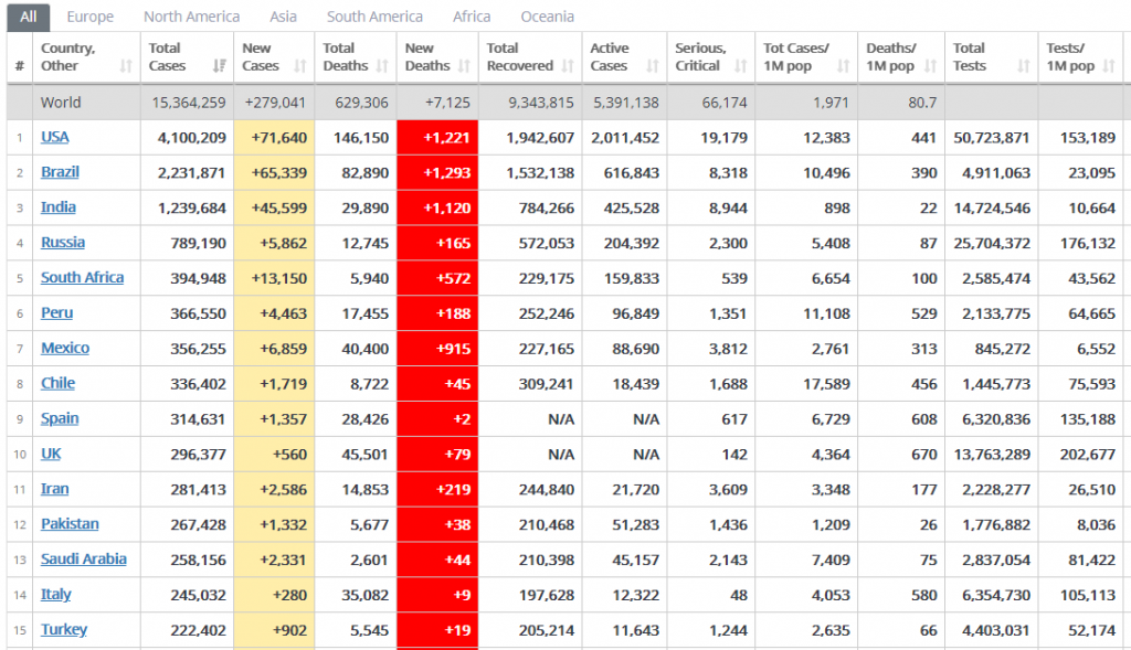 त्यसैगरी ब्राजिलमा ६५ हजार तीन सय ३९, भारतमा ४५ हजार पाँच सय ९९, दक्षिण अफ्रिकामा १३ हजार भन्दा धेरै, मेक्सिकोमा झण्डै सात हजार, रुस र अर्जेन्टिनामा पाँचपाँच हजार भन्दा धेरैमा संक्रमण पुष्टि भएको छ।