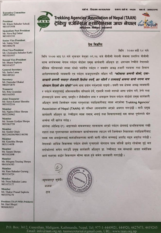 ‘पर्यटन क्षेत्रमा आबद्ध व्यवसायी र पर्यटन मजदुरलाई अविश्वासनीय तरिकाले हेर्ने, एकदमै तल्लो स्तरको भाषा प्रयोग गर्ने, हेप्ने तथा होच्याउने जस्ता भाषा, प्रस्तुति र शैलीसहित शब्द र भनाइहरु नेपाल पर्यटन बोर्डको प्रमुख कार्यकारी अधिकृत जस्तो जिम्मेवार पदमा रहनुभएका पदाधिकारीबाट व्यक्त भएकोमा टानको गम्भीर ध्यानाकर्षण भएको अवगत गराउँछौं’– विज्ञप्तिमा भनिएको छ, ‘प्रमुख कार्यकारी अधिकृत डा. रेग्मीद्वारा व्यक्त भनाई तथा विचारहरुलाई यस संस्था पूर्ण रुपमा घोर भत्र्सना गर्दै खारेज गर्दछ ।’