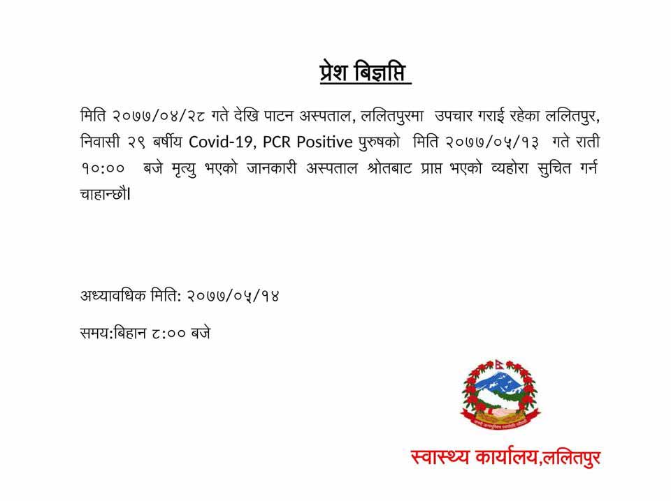 कोरोना संक्रमण देखिएपछि साउन २८ गतेदेखि पाटन अस्पताल भर्ना भएका २९ वर्षीय युवकको उपचारका क्रममा शनिबार राति १० बजे मृत्यु भएको जिल्ला स्वास्थ्य कार्यालय ललितपुरले जनाएको छ।