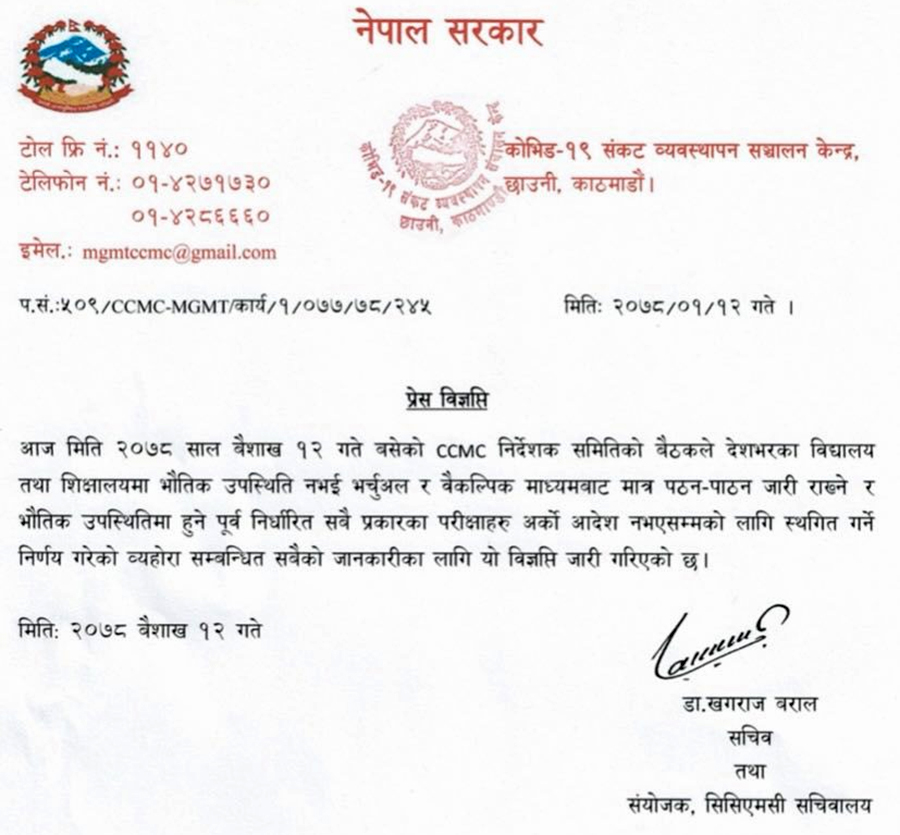 काठमाडौं, वैशाख १३ – सरकारले देशभरका विद्यालय तथा शिक्षालयहरुका पूर्व निर्धारित सबै परीक्षा स्थगित गर्ने निर्णय गरेको छ । आइतबार बसेको कोभिड–१९ सङ्कट व्यवस्थापन सञ्चालन केन्द्र (सीसीएमसी) निर्देशक समितिको बैठकले यस्तो निर्णय गरेको हो ।