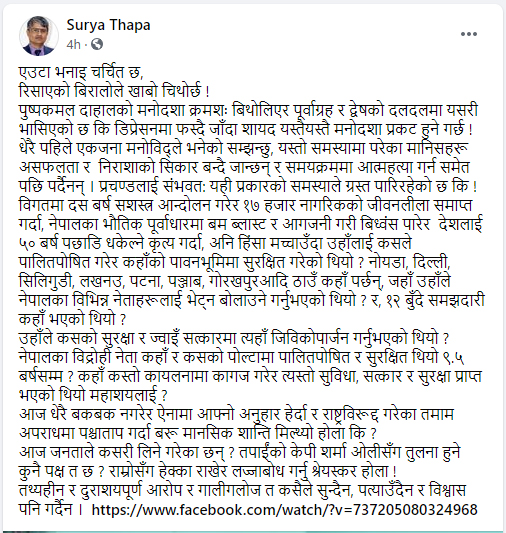 ‘विगतमा दश वर्ष सशस्त्र आन्दोलन गरेर १७ हजार नागरिकको जीवनलीला समाप्त गर्दा, नेपालका भौतिक पूर्वाधारमा बम ब्लास्ट र आगजनी गरी बिध्वंस पारेर देशलाई ५० वर्ष पछाडि धकेल्ने कृत्य गर्दा, अनि हिंसा मच्चाउँदा उहाँलाई कसले पालित पोषित गरेर कहाँको पावनभूमिमा सुरक्षित गरेको थियो ?’, थापाले दाहालसँग प्रश्न गरेका छन् ।