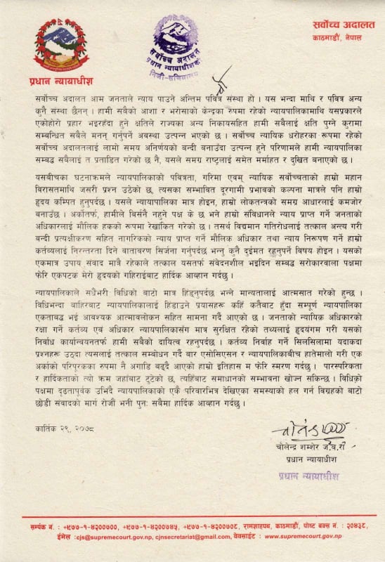 उनले न्यायपालिकाभित्र उत्पन्न गतिरोधका कारण नागरिकहरूका प्रश्न हामीतर्फ नै सोझिएको भन्दै नेपाल बार एशोसिएशन र सर्वोच्च अदालत बार एशोसिएशनलाई संवादका लागि आह्वान गरेका छन् ।