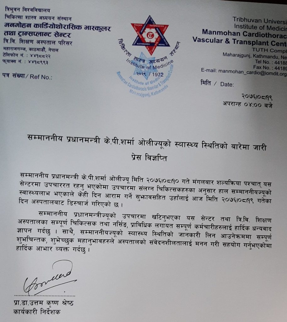 काठमाडौं, मंसिर १९- प्रधानमन्त्री केपी शर्मा ओली बिहीबार अपराह्न ४ बजे अस्पतालबाट डिस्चार्ज भएका छन् । प्रधानमन्त्री ओली १० दिन अस्पताल बसेर आज सरकारी निवास बालुवाटार फर्किएका हुन्।