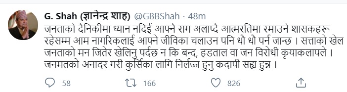 आम हड्तालको विरोध गर्दै उनले अगाडि जोडेका छन्,‘सत्ताको खेल जनताको मन जितेर खेलिनु पर्दछ न कि बन्द, हडताल वा जन विरोधी कृयाकलापले। जनमतको अनादर गरी कुर्सीका लागि निर्लज्ज हुनु कदापी सह्य हुन्न।’