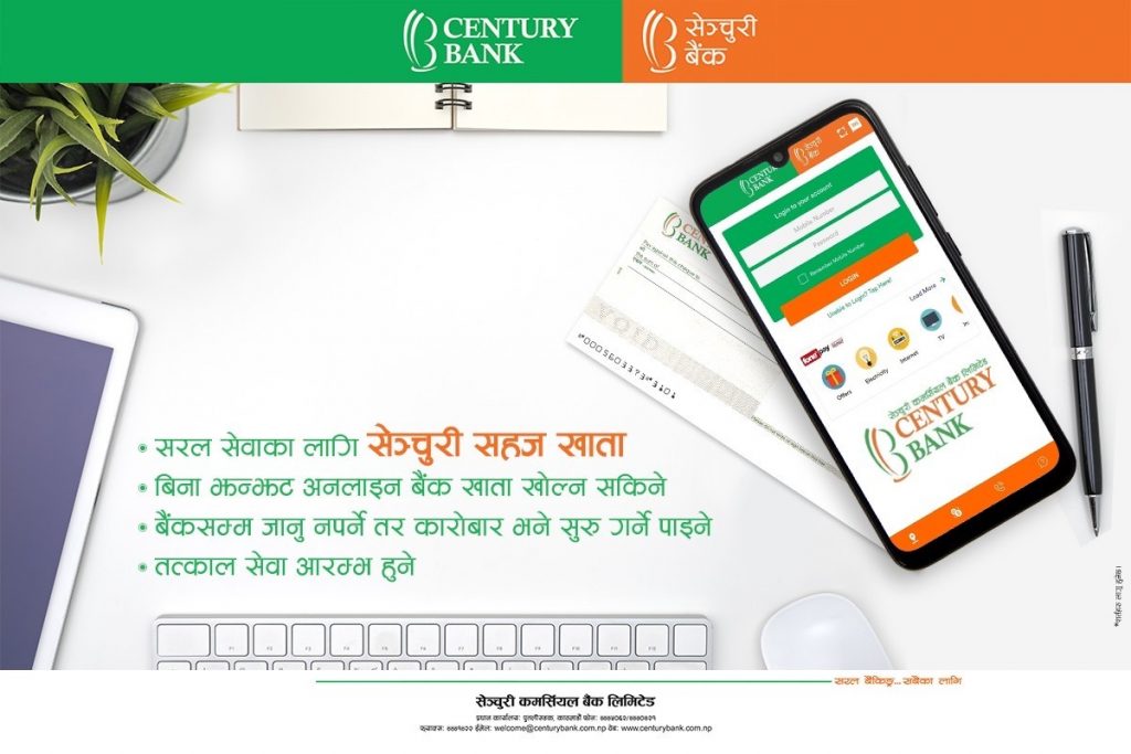 बैंकको अनलाइन एकाउन्ट सेवा https://onlineaccount.centurybank.com.np/ याे लिंकबाट लिन सकिन्छ ।