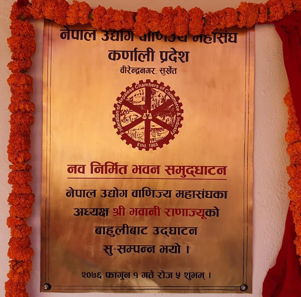 काठमाडौं,फागुन १- नेपाल उद्योग वाणिज्य महासघंका अध्यक्ष भवानी राणाले महासंघको कर्णाली प्रदेशको नवनिर्मित भवनको आज एक कार्यक्रमकाबीच उद्घाटन गरेकी छिन्।