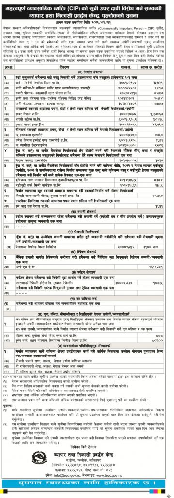 काठमाडौं,माघ २३ -सरकारले राष्ट्रिय अर्थतन्त्रमा महत्वपूर्ण योगदान दिने व्यक्ति तथा संस्थालाई दिने महत्वपूर्ण व्यवसायिक व्यक्ति (सिआइपी) बाट विभिन्न व्यसायीहरुलाई सम्मानगर्ने भएको छ । सरकारले आजसिआइपीबाट सम्मानगर्ने व्यक्तिहरुको नामावली प्रकाशित गरेको छ ।