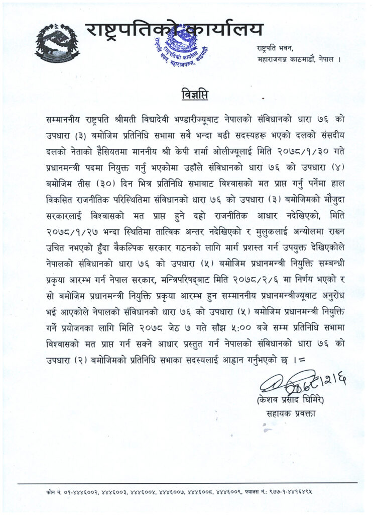 काठमाडौं, जेठ ६ – राष्ट्रपति विद्यादेवी भण्डारीले संविधानको धारा ७६(५) अनुसार नयाँ सरकार गठन गर्न आह्वान गरेकी छन् । उनले भोलि शुक्रबार साँझ ५ बजेसम्ममा वैकल्पिक सरकार गठनका लागि समय तोक्दै यस्तो आह्वान गरेकी हुन् ।