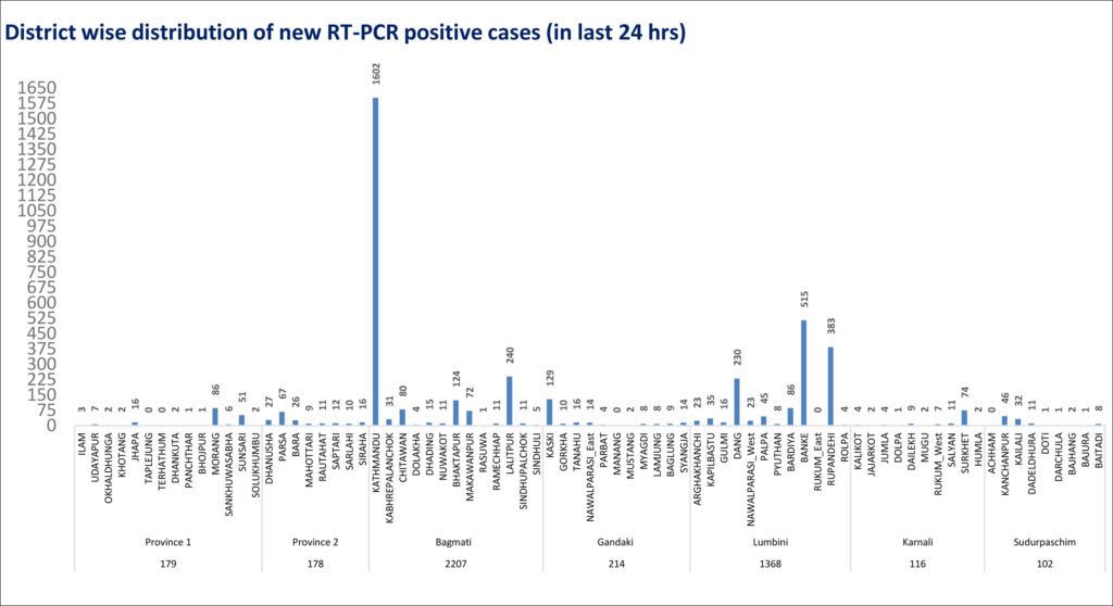 संक्रमितमध्ये बैभन्दा बढी संघीय राजधानी समेत रहेको बागमती प्रदेशमा २२०७ जना छन् । त्यस्तै लुम्बिनी प्रदेशमा १३६८ जना संक्रमित थपिएका छन् ।