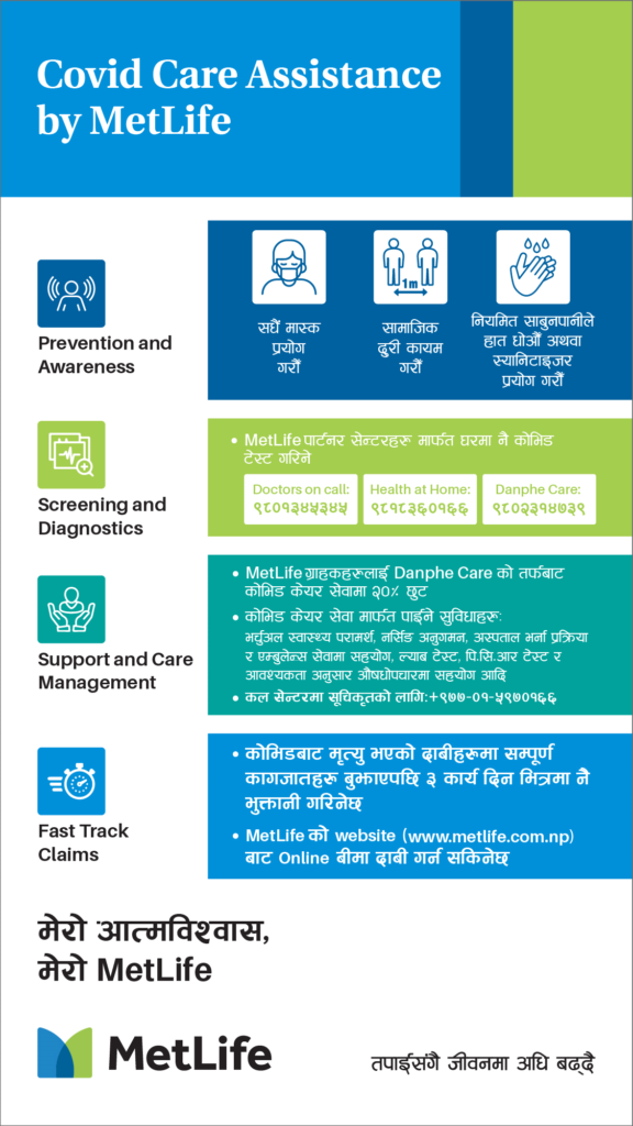 काठमाडौं, वैशाख १९ – हाल व्याप्त कोभिड–१९ को अवस्थाबाट प्रभावित ग्राहकहरुको सहयोगार्थ मेटलाइफ नेपालले कोभिड केयर सहायता कार्यक्रमको शुरुवात गरेको छ । जस अन्तर्गत कोभिड–१९ का कारण भएको मृत्यु दावीमा ३ कार्यदिन भित्रै द्रुतमार्गी बीमा भुक्तानी सेवा प्रदान गरिने कम्पनीले जनाएको छ ।