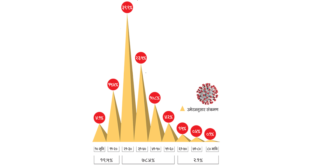 मन्त्रालयका प्रवक्ता डा। जागेश्वर गौतमका अनुसार यीमध्ये बहुसंख्यक ७५ प्रतिशतभन्दा बढी २१ देखि ६० वर्ष उमेरसमूहका छन्। ६० भन्दा माथिको उमेरसमूहका संक्रमितको संख्या २।१ प्रतिशत छ। १० वर्षमुनिका बालबालिकाको संक्रमण ४ प्रतिशत छ।