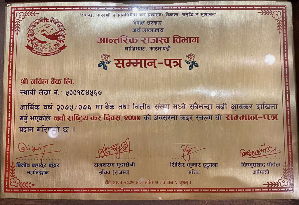 विभागले गत मंसिरमा कर दिवसको अवसर पारेर बैंकलाई बैंकहरुमध्ये सबैभन्दा बढि कर्पाेरेट ट्याक्स जम्मा गर्ने सुचीमा नबिल बैंकलाई राखेको थियो । मंसिरमा कोभिडको भय र तिहारको समय भएकाले औपचारिक कार्यक्रम भने भएको थिएन ।