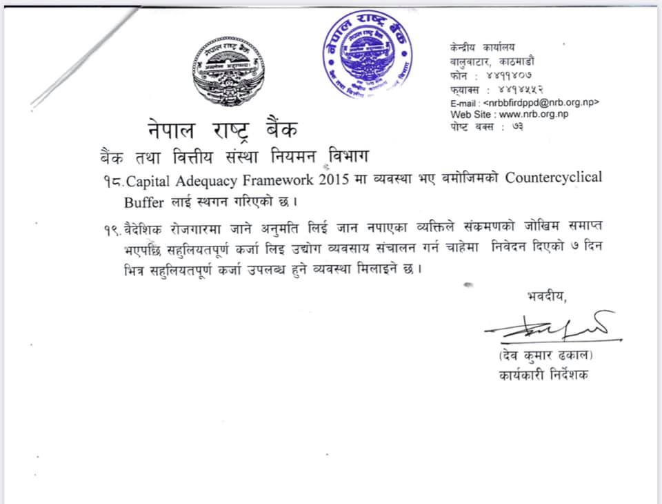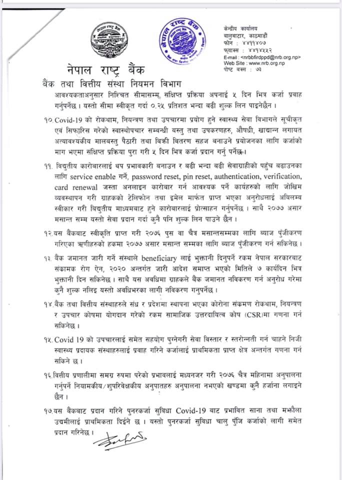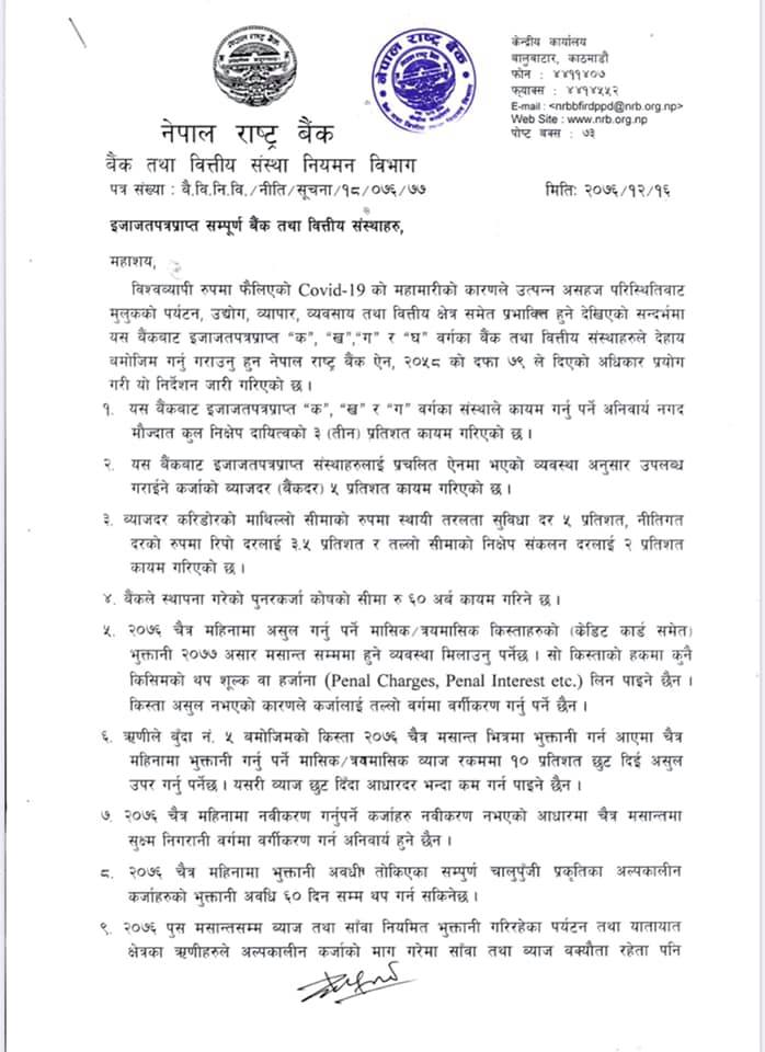 ‘०७६ चैतमा असुल गनुपर्ने मासिक, त्रैमासिक किस्ताको भुक्तानी ०७७ असारसम्म हुने व्यवस्था मिलाउनुपर्नेछ,’ राष्ट्र बैंकको निर्देशनमा भनिएको छ । सो किस्ताको हकमा कुनै किसिमको थप शुल्क वा हर्जाना लिन नपाइने पनि राष्ट्र बैंकले प्रस्ट्याएको छ । यस्तै कर्जा असुल नभएको हकमा बैंकले सो कर्जालाई खराब कर्जामा राख्नु नपर्ने सुविधा पनि राष्ट्र बैंकले बैंक तथा वित्तीय संस्थालाई दिएको छ ।