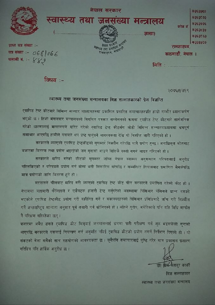 मन्त्रालयका विज्ञ सल्लाहकार डा.खेमबहादुर कार्कीले बुधबार निकालेको विज्ञप्तिमा सरकारले चीनबाट खरिद गरेको कीटको गुणस्तर जाँच्न नेपाल स्वास्थ्य अनुसन्धान परिषद्लाई अनुरोध गरिसकिएको उल्लेख छ ।