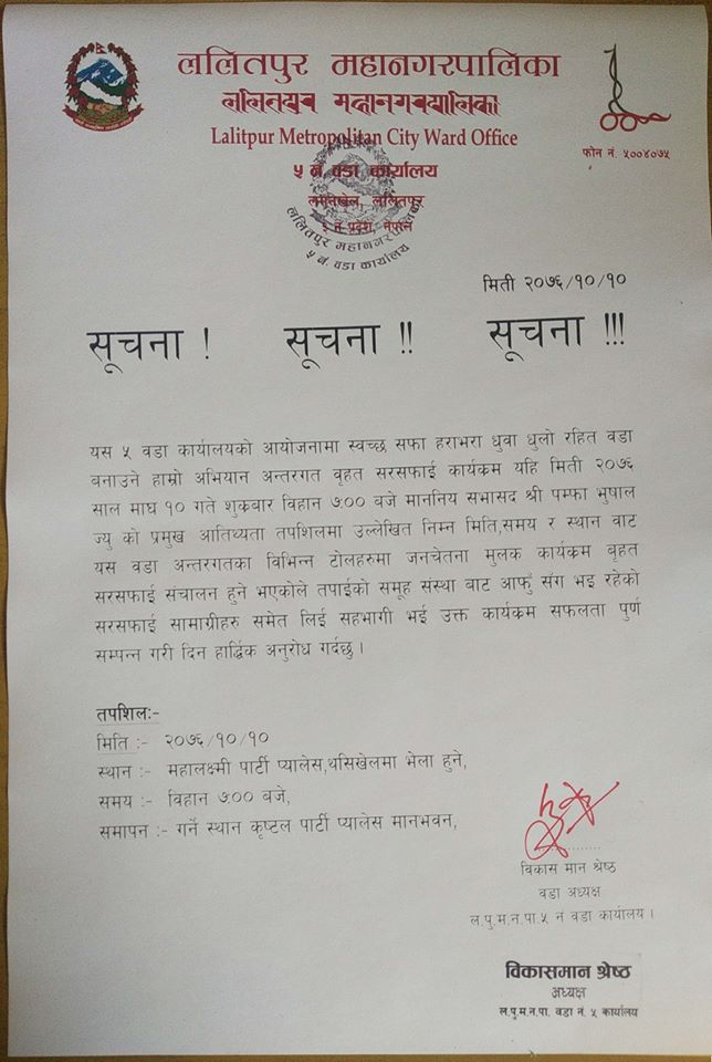 ललितपुर, ०८ माघ -ललितपुर महानगरपलिकाका बोर्ड सदस्य, ०५ नंंबर वडाका वडाध्यक्ष विकास श्रेष्ठले ललितपुर ०५ लाई स्वच्छ, सफा हराभरा र धुवा-धुलोरहित वडा बनाउने अभियान अघि सारेका छन् । वडाअध्यक्षमा निर्वाचित भएर आईइसके पस्चात् उनले विकास निर्माणसँगसँगै नगरको सरसफार्इलाई बिशेष प्राथमिकता दिदै आएका छन् । त्यसो त आफनो नेतृत्वकालमा वडालाई नमुना वडा बनाउने प्रणका साथ अध्यक्ष श्रेष्ठ कम्मर कसेर लागेका छन् । उनको उर्जाशील ब्यक्तित्व र विकासप्रेमी सोच उनको सवल पक्ष हो । त्यसो त विभिन्न औपचारिक एवम् अनौपचारिक कार्यक्रम माझ अध्यक्ष श्रेष्ठको जुझारुपन र खटनको चर्चासँगसँगै उनको कार्यशैलीको तारिफ हुँदै आएको पाईन्छ । उनका लागि त्यस्तै प्रशंसाले पुलकित हुने दिन रहयो गत बुधवार अर्थात माघ ०८ गते । कार्यक्रम थियो उही वातावरण सम्बन्धी । वडाले माघ १० गते बृहत् सरसफाइ कार्यक्रमको आयोजना गर्न लागेको छ । र सरसफाई अभियानलाई तिब्रता दिने उदेश्यले सो कार्यक्रमको पूर्व सन्ध्यामा ०८ गते ुस्वच्छ, हराभरा र धुवाँ(धुलोरहित वडा बनाउने अभियान अन्तर्गत बृहत अन्तर्क्रियात्मक कार्यक्रमको आयोजना गरेको थियो ।सरोकारवालाहरुको बाक्लो उपस्थिती माझ सम्पन्न सो कार्यक्रम माझ सहभागीहरुले वत्ताका रुपमा बोल्दै गर्दा वातावरणिय रुपमा वडाको विगत, वर्तमान र भविष्यका बिषयमा केन्द्रित रहदै राय, सुझाव र धारणा राख्दै वडाको सरसफाई अभियानलाई सफल पार्न साथ दिने कुरा मात्र गरेनन् कि यस वाहेक पनि उनीहरुले वडा अध्यक्ष श्रेष्ठको सोच, शैली र जाँगरको मुक्तकण्ठले प्रशंसा गरे । कार्यक्रममा वडा सदस्य, टोल विकास संस्था, स्थानिय क्लब, महिला समुह, वातावरणको क्षेत्रमा सेवारत संस्था, शैक्षिक प्रतिष्ठान, व्यवसायी, नेपाली सेना, नेपाल प्रहरी लगायतका निकायका प्रतिनिधीहरुले उपस्थिती जनाएका थिए ।