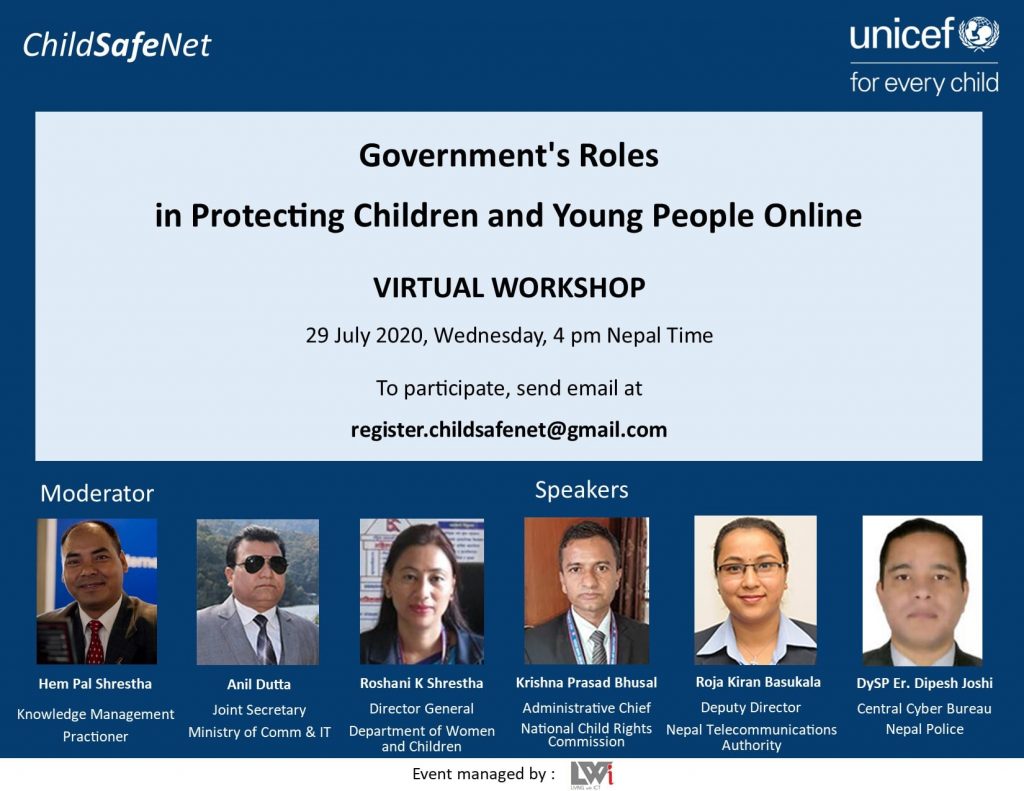 विभिन्न ६ वटा भर्चुअल वर्कसपमा बालबालिका, अभिभावक, युवा, नेपाल दूरसञ्चार प्राधिकरण, इन्टरनेट सेवा प्रदायक, सरोकारवाला तथा सरकारसँग छलफल गरिएको थियो । विभिन्न निकाय र व्यत्तिहरुसँगको छलफलबाट नेपालमा बालबालिका र युवाहरु इन्टरनेटको प्रयोग कसरी गरिरहेका छन, यसको दुरुपयोग कसरी हुन्छ र यसको निवारणको लागि अभिभावकदेखि सरकारसम्मले कस्तो तयारी र योजनाहरु बनाउनुपर्छ भन्ने कुरामा जोड दिइएको थियो ।