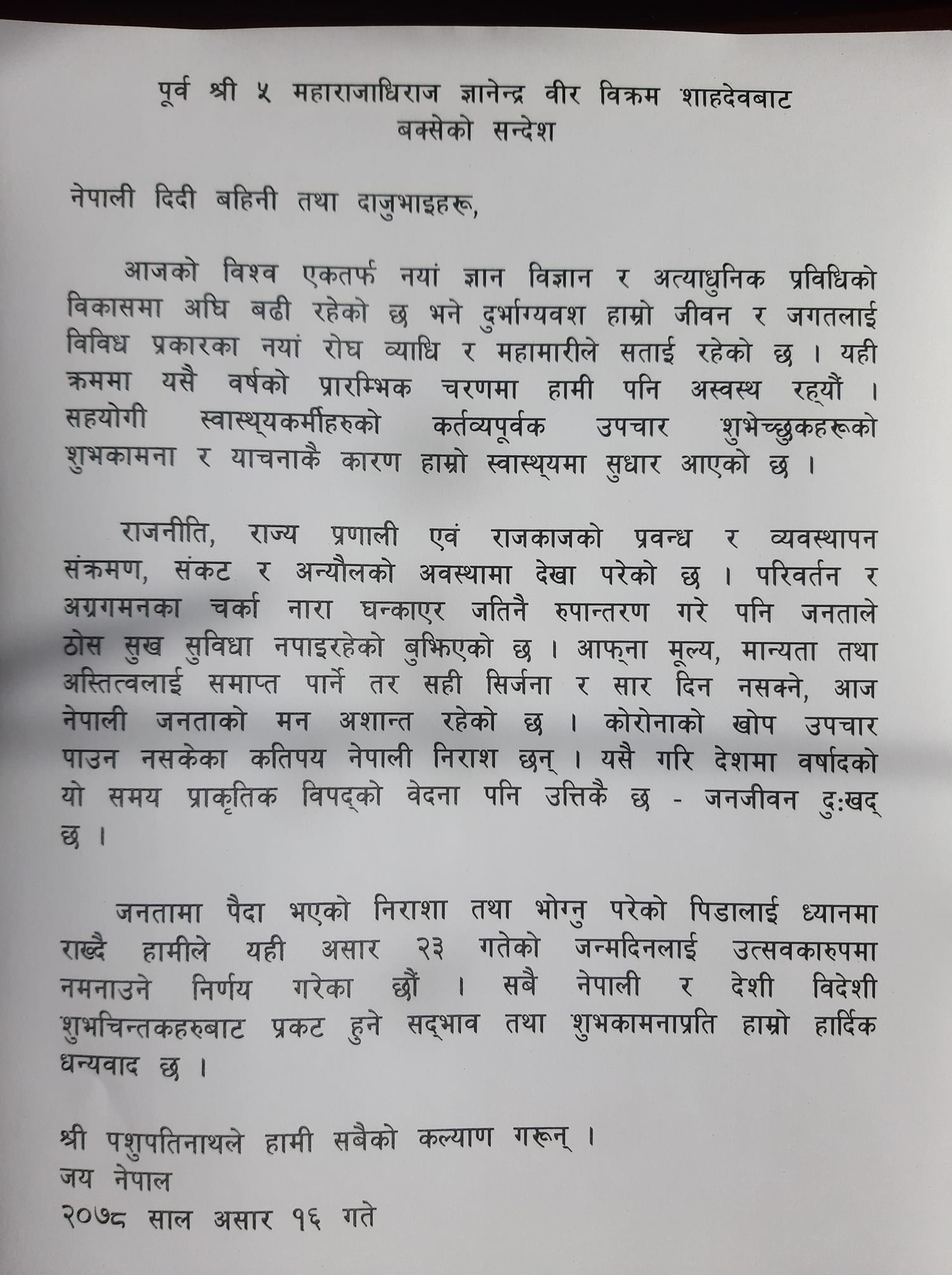 तर, कोभिड १९ को महामारी र वर्षाजन्य विपत्का कारण जनजीवन दुःखद् अवस्थामा रहेको भन्दै आफ्नो जन्मदिनलाई उत्सवका रुपमा नमनाउने निर्णय गरेको पूर्वराजा शाहले जानकारी दिएका छन्।