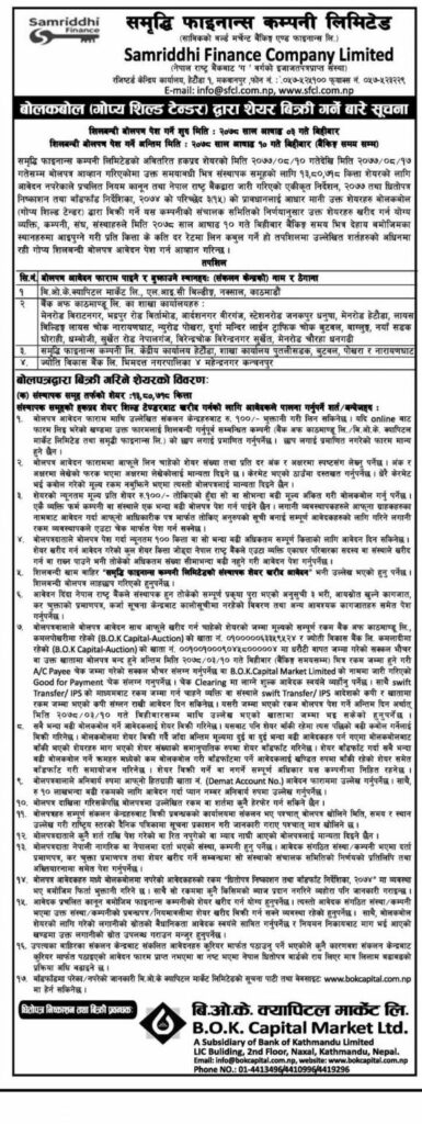 काठमाडौं, जेठ २७ – समृद्धि फाइनान्स कम्पनीले आगामी असार ३ गतेदेखि बोलकबोलमार्फत १३ लाख ८० हजार ७१८ कित्ता शेयर विक्री गर्ने भएको छ । फाइनान्सले अवितरित उक्त परिमाणको हकप्रद शेयर विक्री गर्न लागेको हो ।