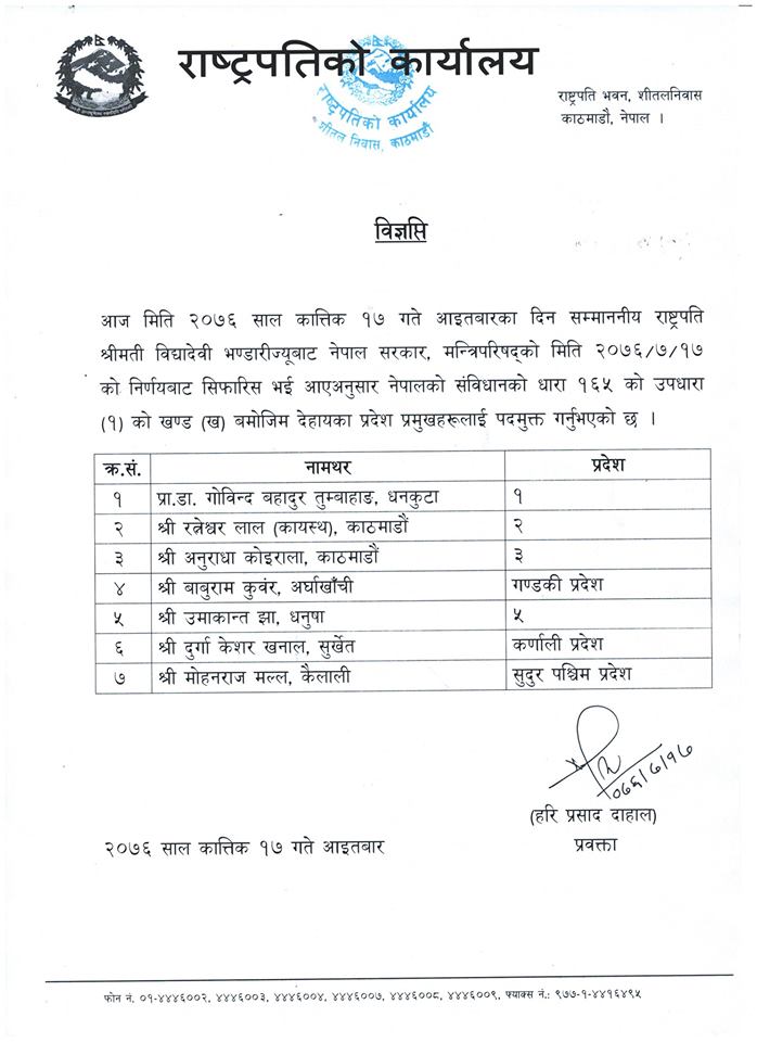 सरकारको सिफारिसमा राष्ट्रपति विद्यादेवी भण्डारीले उनीहरुलाई पदमुक्त गरेकी हुन् । राष्ट्रपति कार्यालयले विज्ञप्ति जारी गरी उनीहरुलाई पदमुक्त गरिएको बताए ।संविधानको धारा १६५ को उपधारा १ को खण्ड अनुसार प्रदेश प्रमुख प्रदेश प्रमुखहरुलाई पदमुक्त गरिएको राष्ट्रपति कार्यालयले जनाएको छ ।