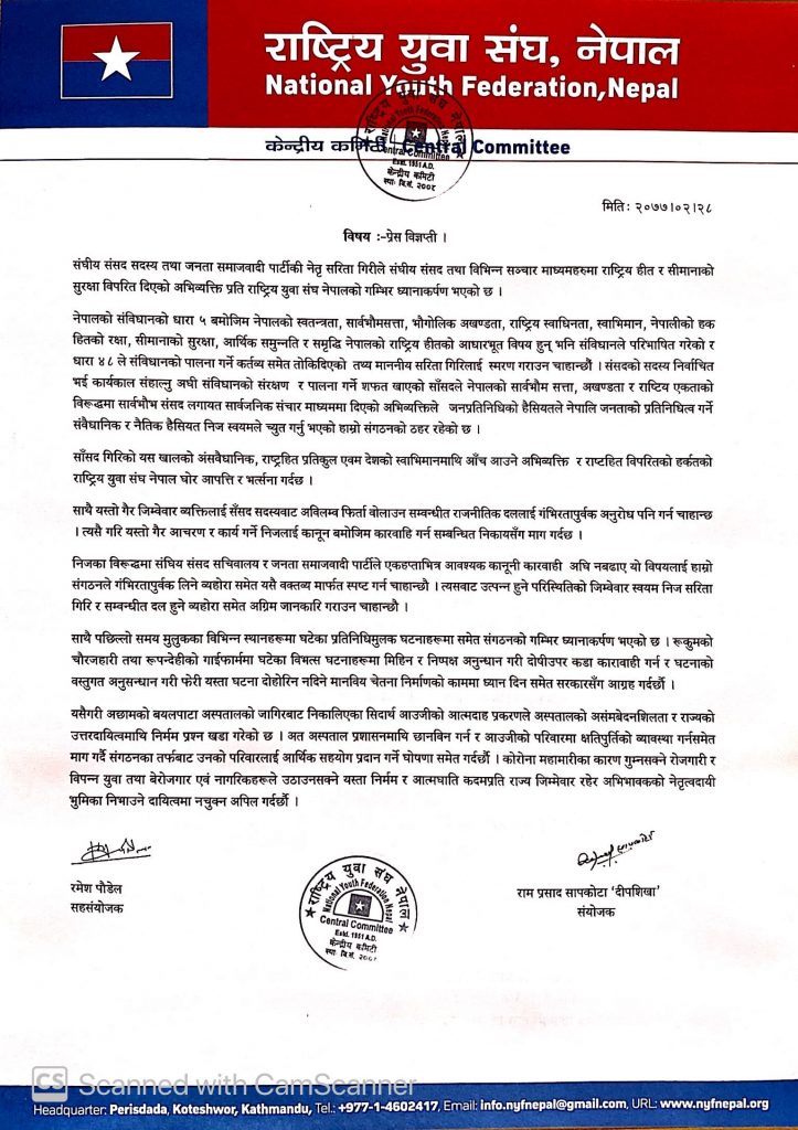सांसद गिरीको अंसवैधानिक, राष्ट्रहित प्रतिकुल एवम देशको स्वाभिमानमाथि आँच आउने अभिव्यक्ति र राष्टहित विपरितको हर्कतको राष्ट्रिय युवा संघ नेपालले घोर आपत्ति र भत्र्सना गरेको छ ।