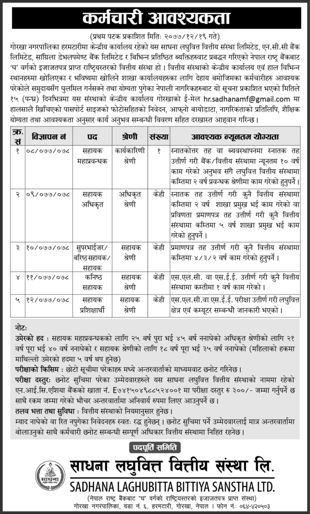 काठमाडौं, चैत २२ –साधना लघुवित्त वित्तीय संस्थाले विभिन्न पदहरुमा कर्मचारीहरुको लागि दरखास्त आव्हान गरेको छ ।लघुवित्तले जारी गरेको सूचना अनुसार सहायक महाप्रबन्धक एक सहित सहायक अधिकृत, सुपरभाईजर ,बरिष्ठ सहायक,सहायक, कनिष्ठ सहायक, सहायक प्रशिक्षार्थी पदहरुमा केही संख्यामा कर्मचारी माग गरिएको छ ।चैत १९ गते वित्तीय संस्थाले प्रकाशित गरेको सूचनामा जनाए अनुसार आफ्नाे योग्यता पुगेका जो कसैले सूचना प्रकाशित भएको मितिले १५ दिन भित्र उक्त पदका लागि दरखास्त दिन सक्ने लघुवित्तले जनाएको छ ।