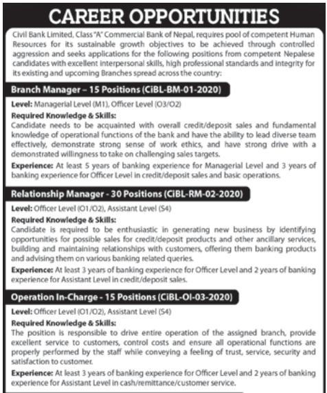बैंकले १५ जना ब्राञ्च म्यानेजर , ३० जना रिलेशनसीप म्यानेजर , १५ जना अप्रेशन इञ्चार्ज र ५० जना अप्रेशन असिस्टेन्ट पदकालागि आवेदन माग गरिएको हो ।